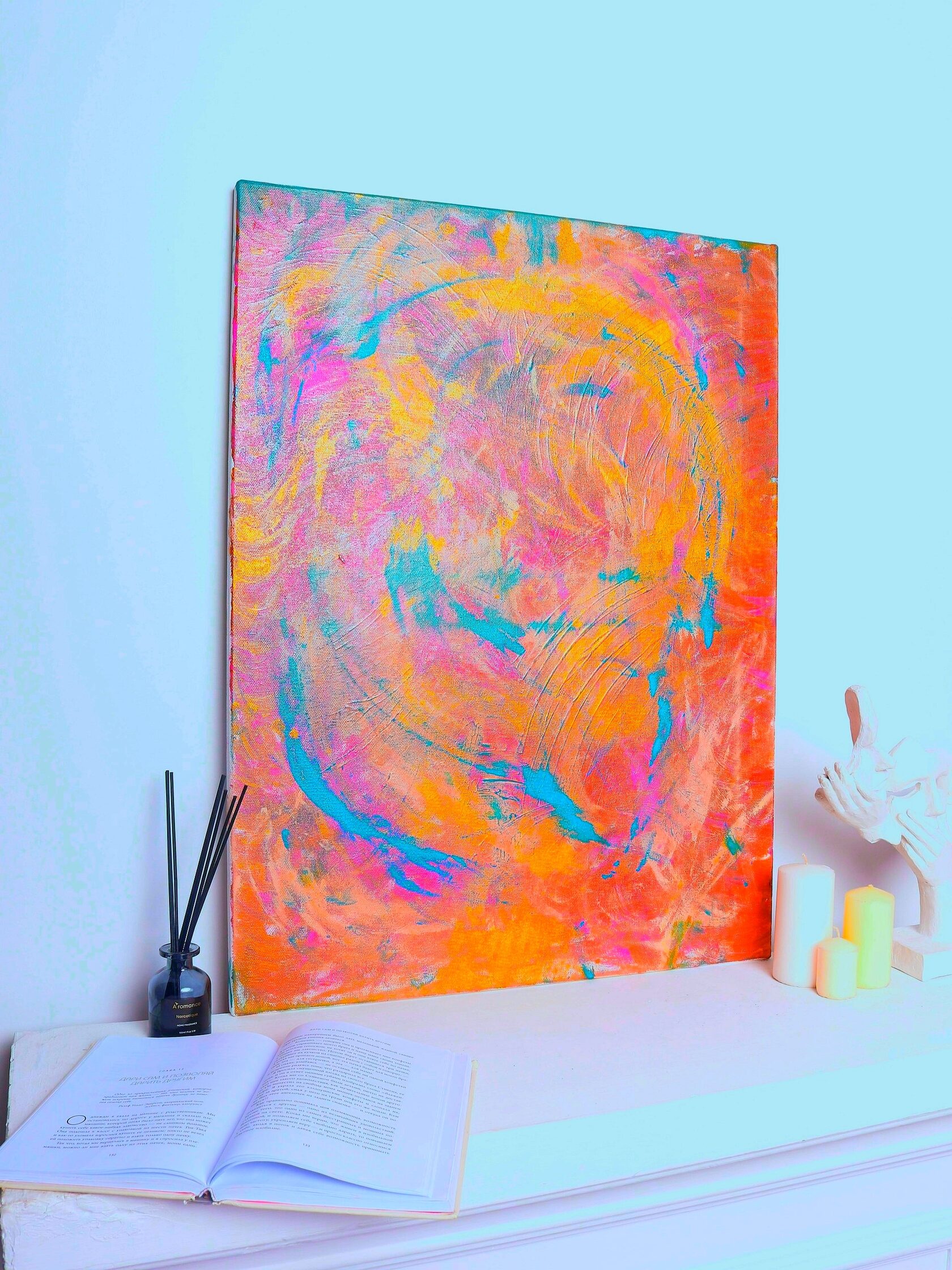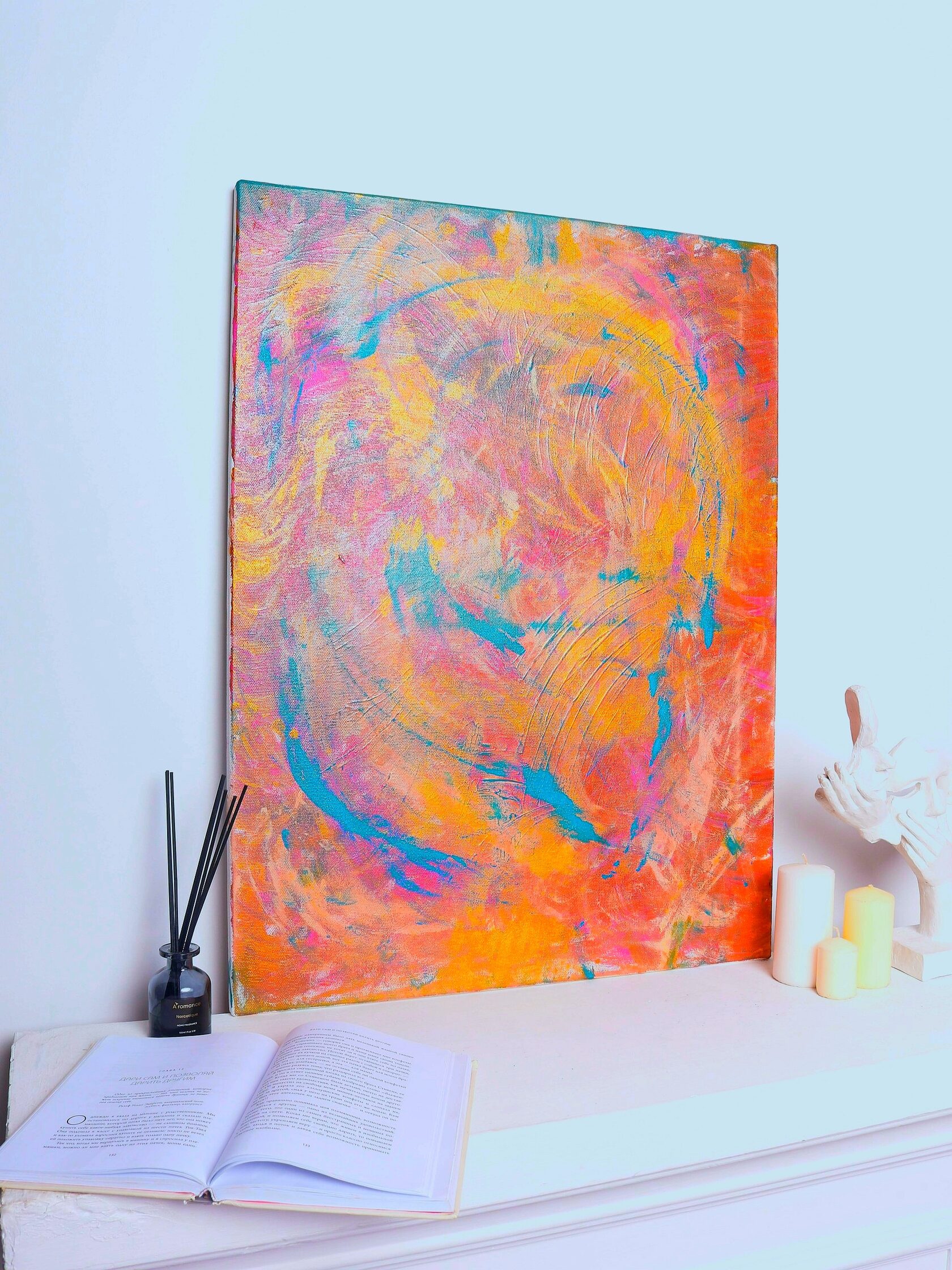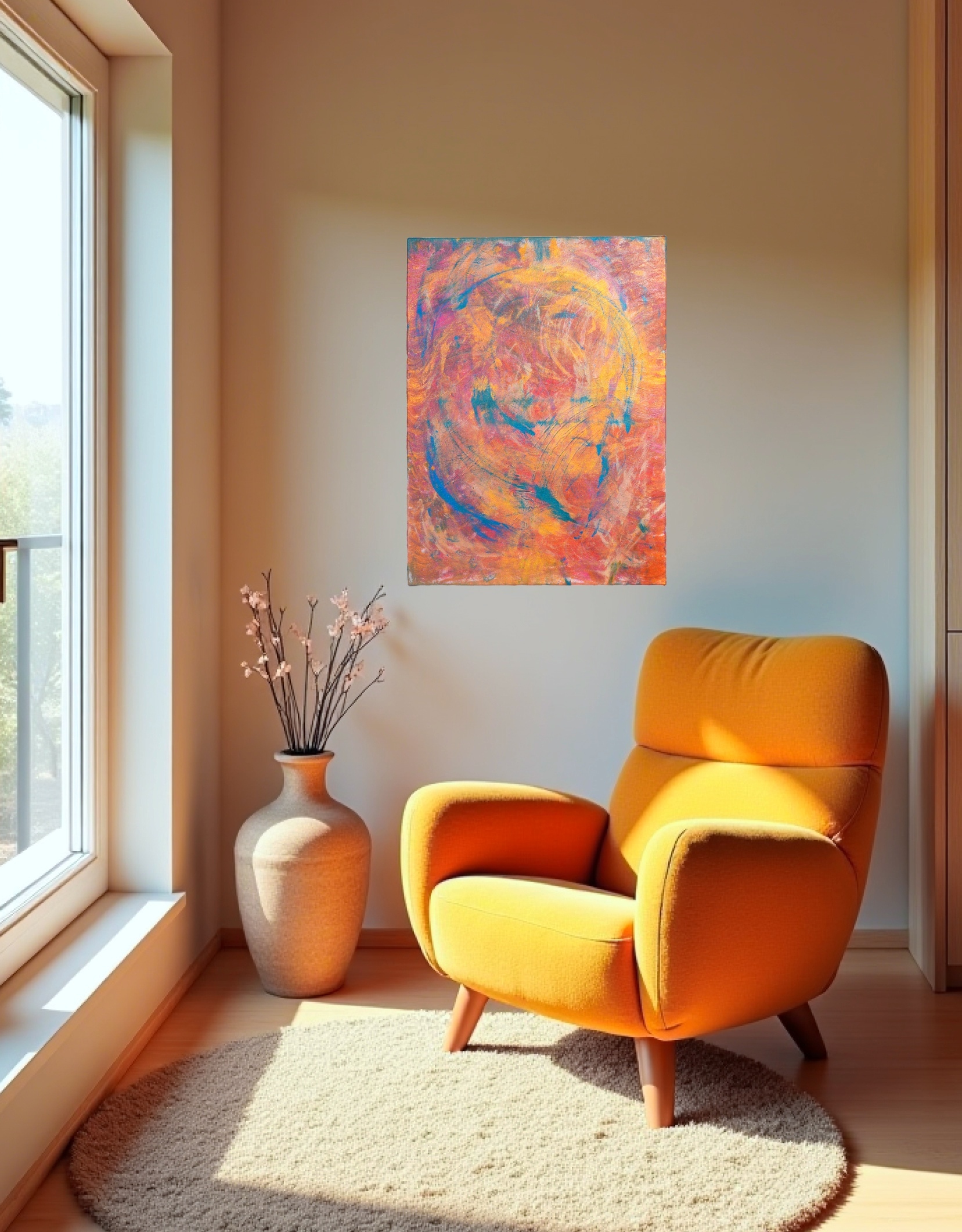 Розовый цвет – словно свет сквозь облака. Он мягко растворяется в яркой палитре, делая краски глубже, а эмоции – сильнее. Этот оттенок не просто цвет – он дышит, напоминая о любви и нежности. Присмотрись к розовому свечению. Это не просто цвет – если долго смотреть, кажется, будто он пульсирует. Такой эффект создан особым слоистым нанесением гуаши.
