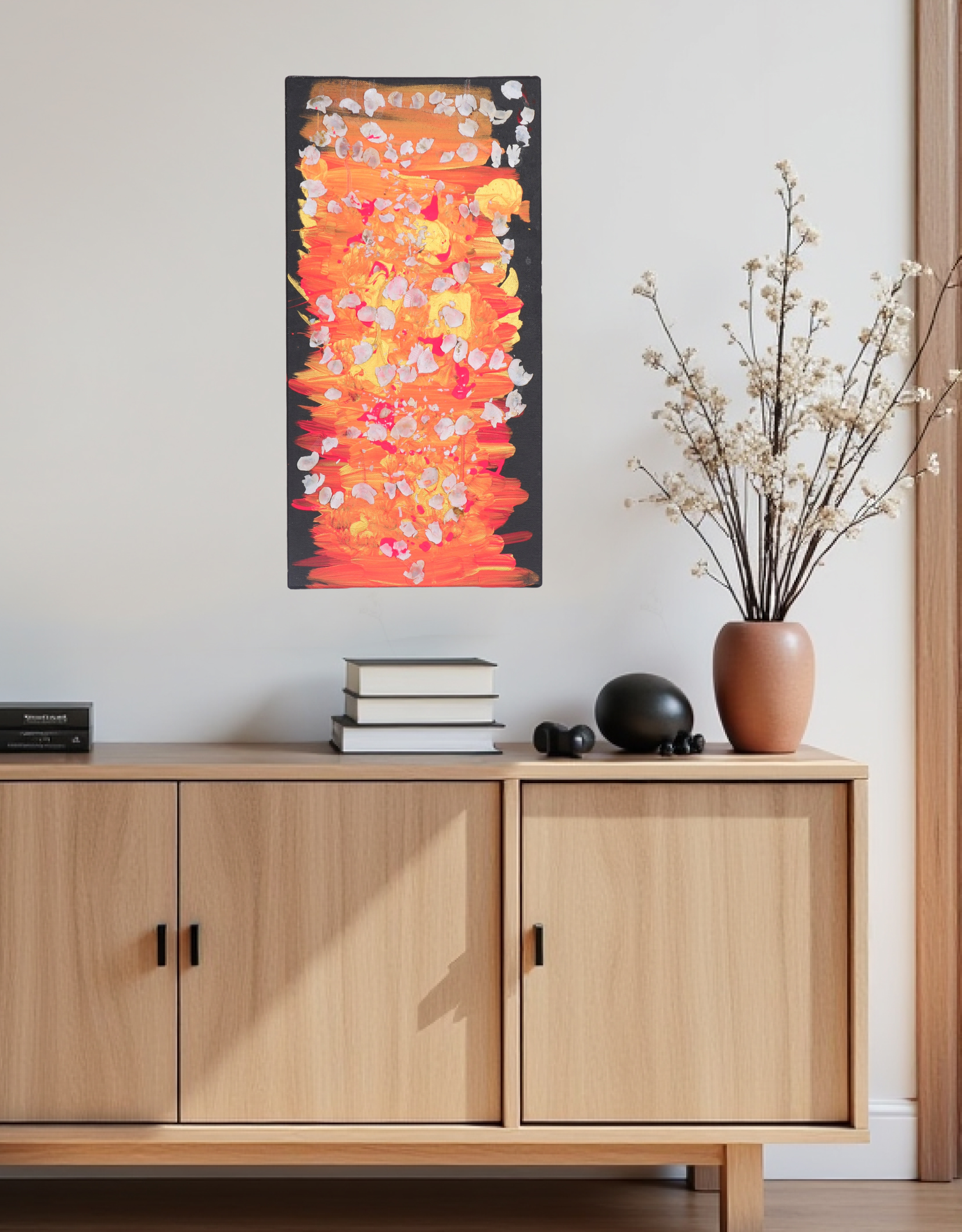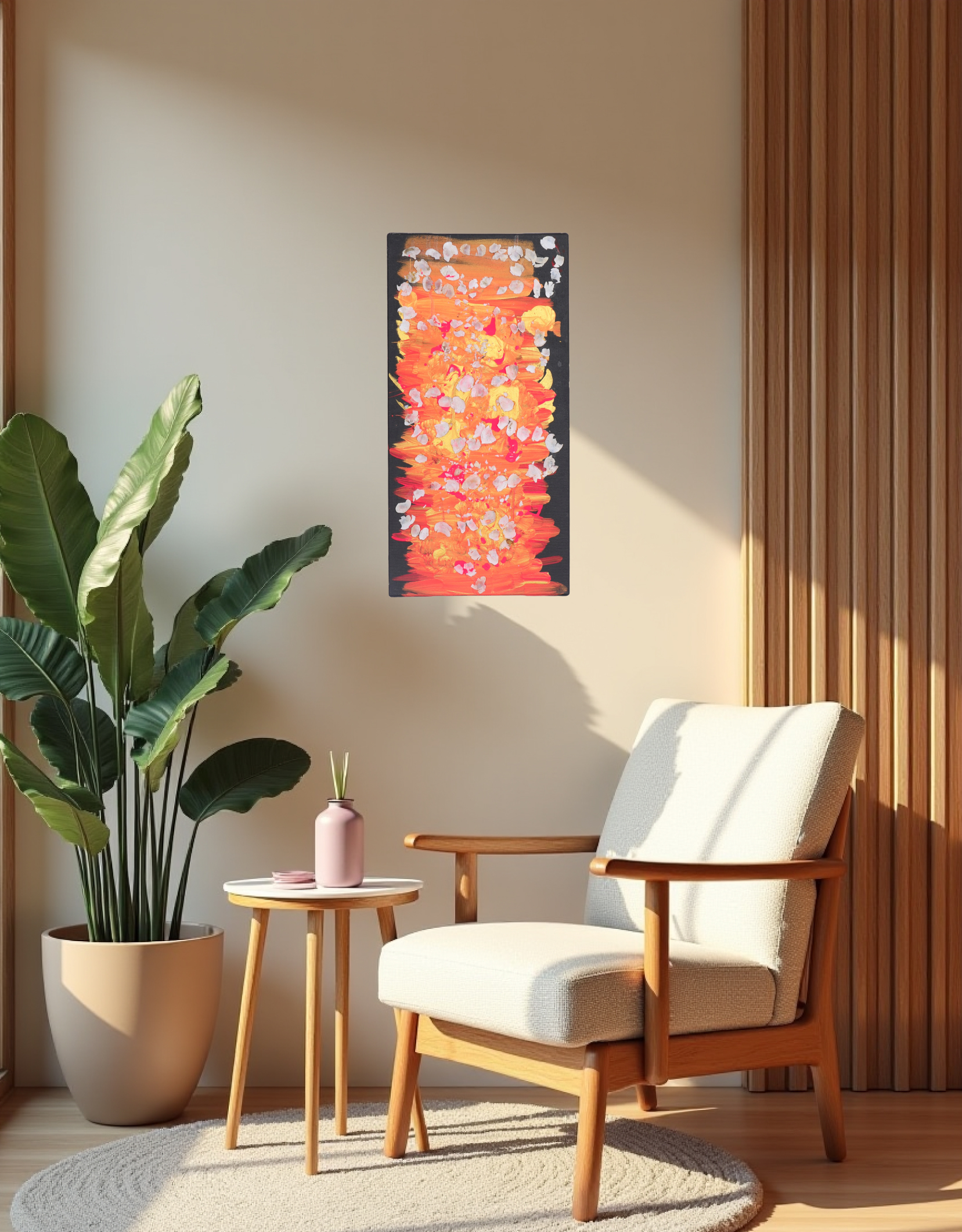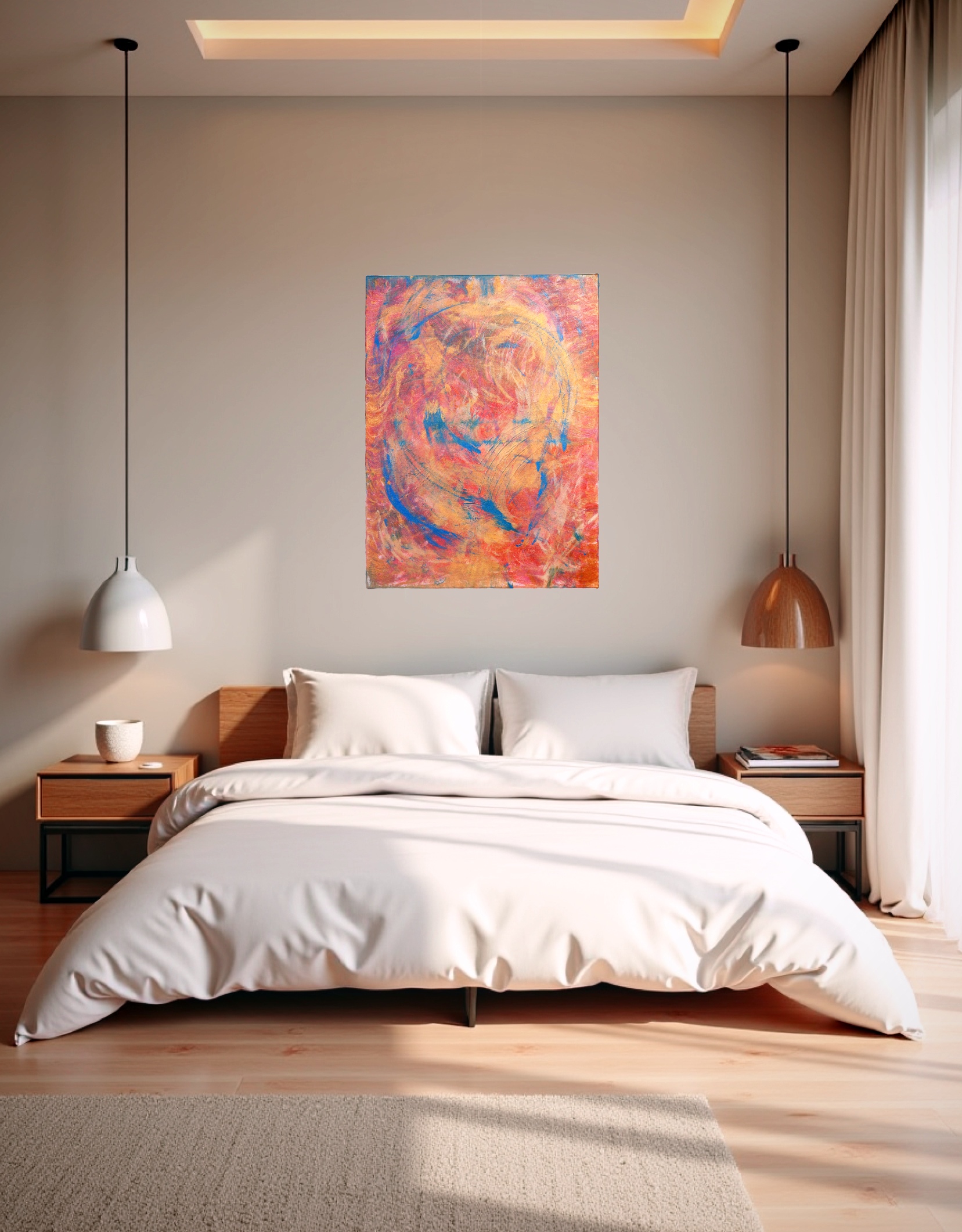 Розовый цвет – словно свет сквозь облака. Он мягко растворяется в яркой палитре, делая краски глубже, а эмоции – сильнее. Этот оттенок не просто цвет – он дышит, напоминая о любви и нежности. Присмотрись к розовому свечению. Это не просто цвет – если долго смотреть, кажется, будто он пульсирует. Такой эффект создан особым слоистым нанесением гуаши.